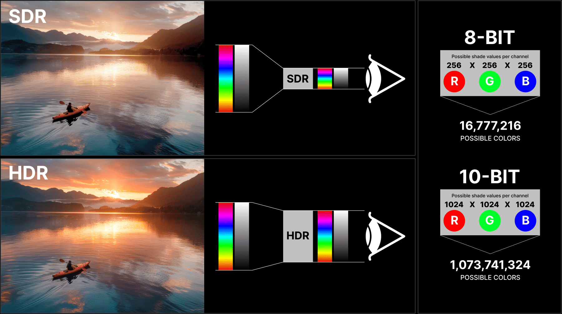 10-bit video preserves massively more picture information, both in terms of color and brightness, than 8-bit formats. The number of colors goes from millions to billions and the detail within the brightness range – the highlights and shadows in the image – is more than 4 times that of 8-bit.