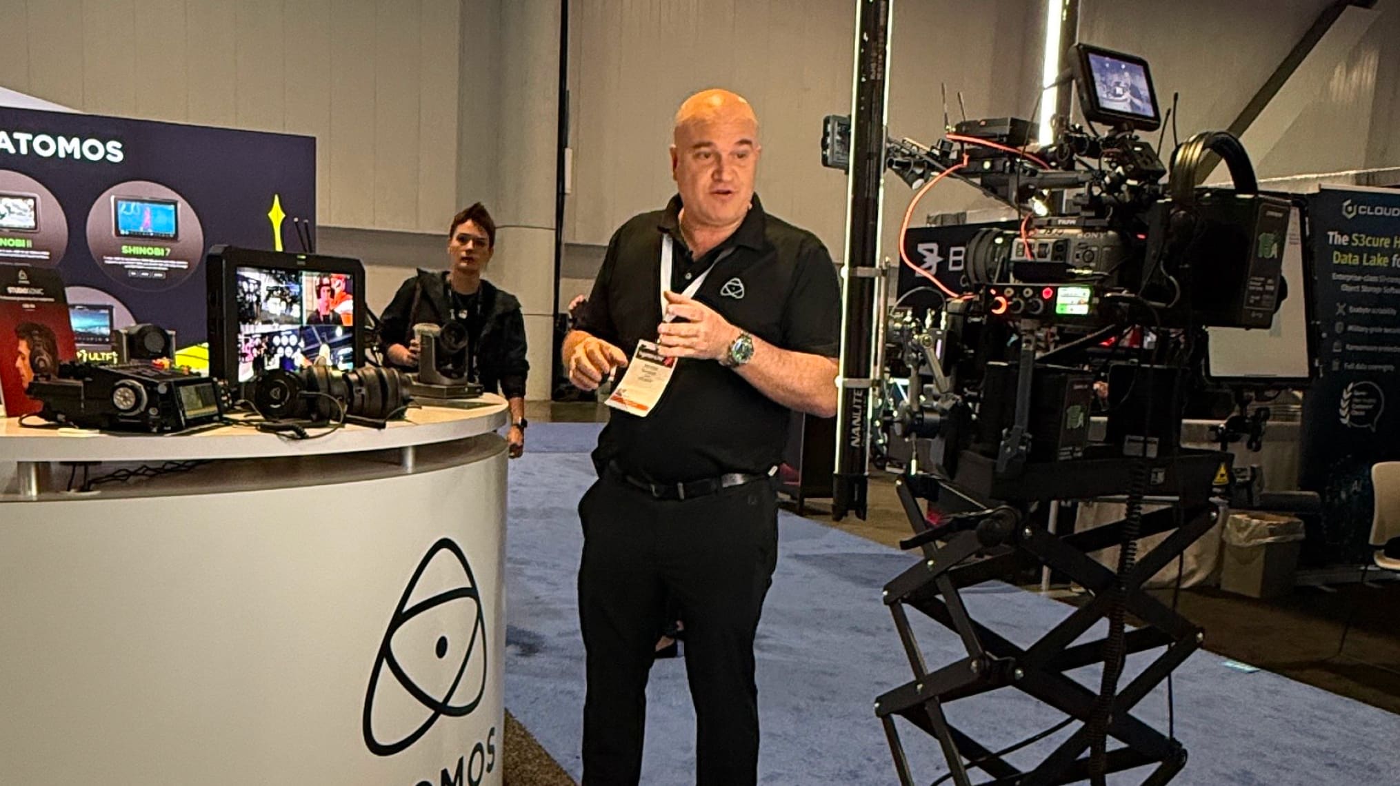 His primary rig features a Sony FX6 camera with a wide-angle lens, securely mounted on a Studio Titan America scissor camera stand for extra support. “I didn’t even know such a stand existed – it’s phenomenal. The moment I took it out of the box, I knew this would be my new rolling stand at trade shows. It’s incredibly stable and very easy to manoeuver,” he adds.