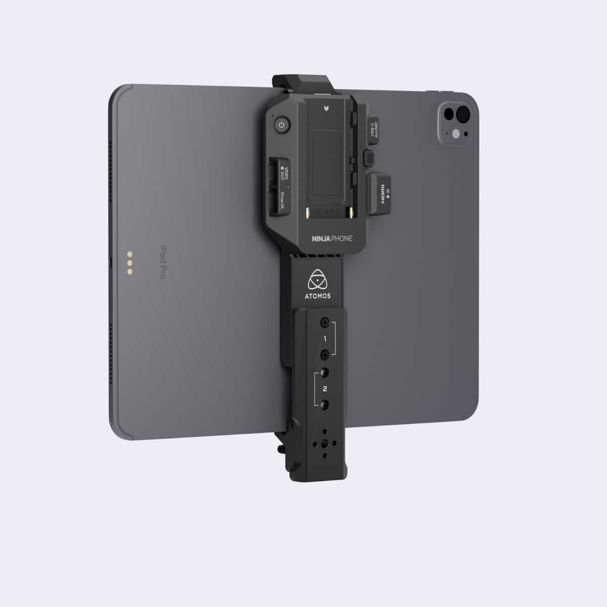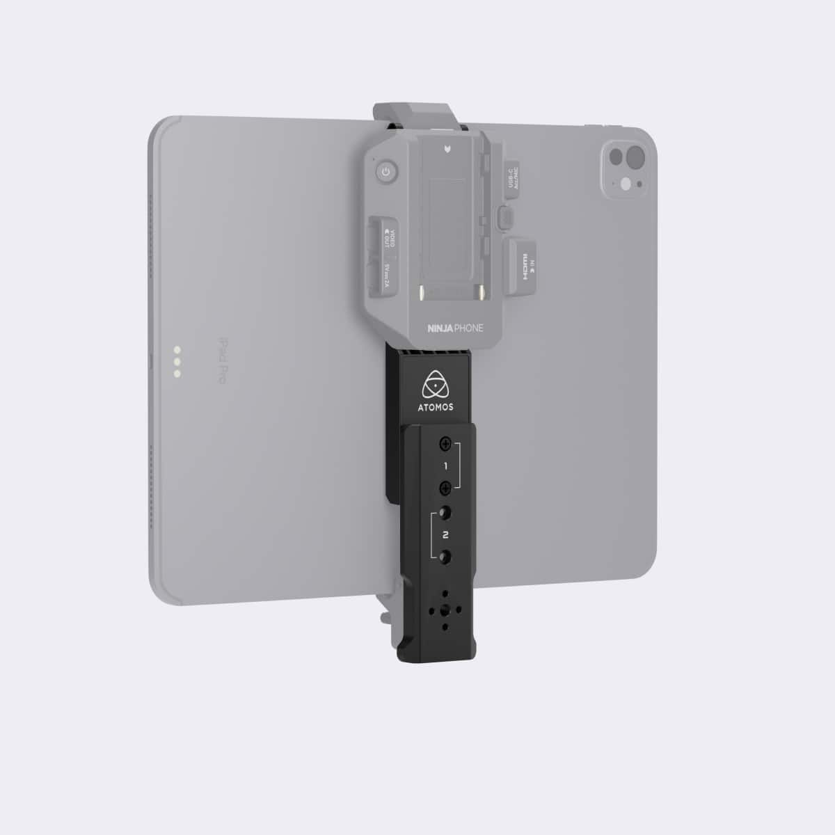 Adjustable high-quality, clamp extender for attaching compatible 11-inch and 13-inch iPads to Ninja Phone. Includes 1/4-inch 20 mount holes with anti-rotation locking pin holes.
