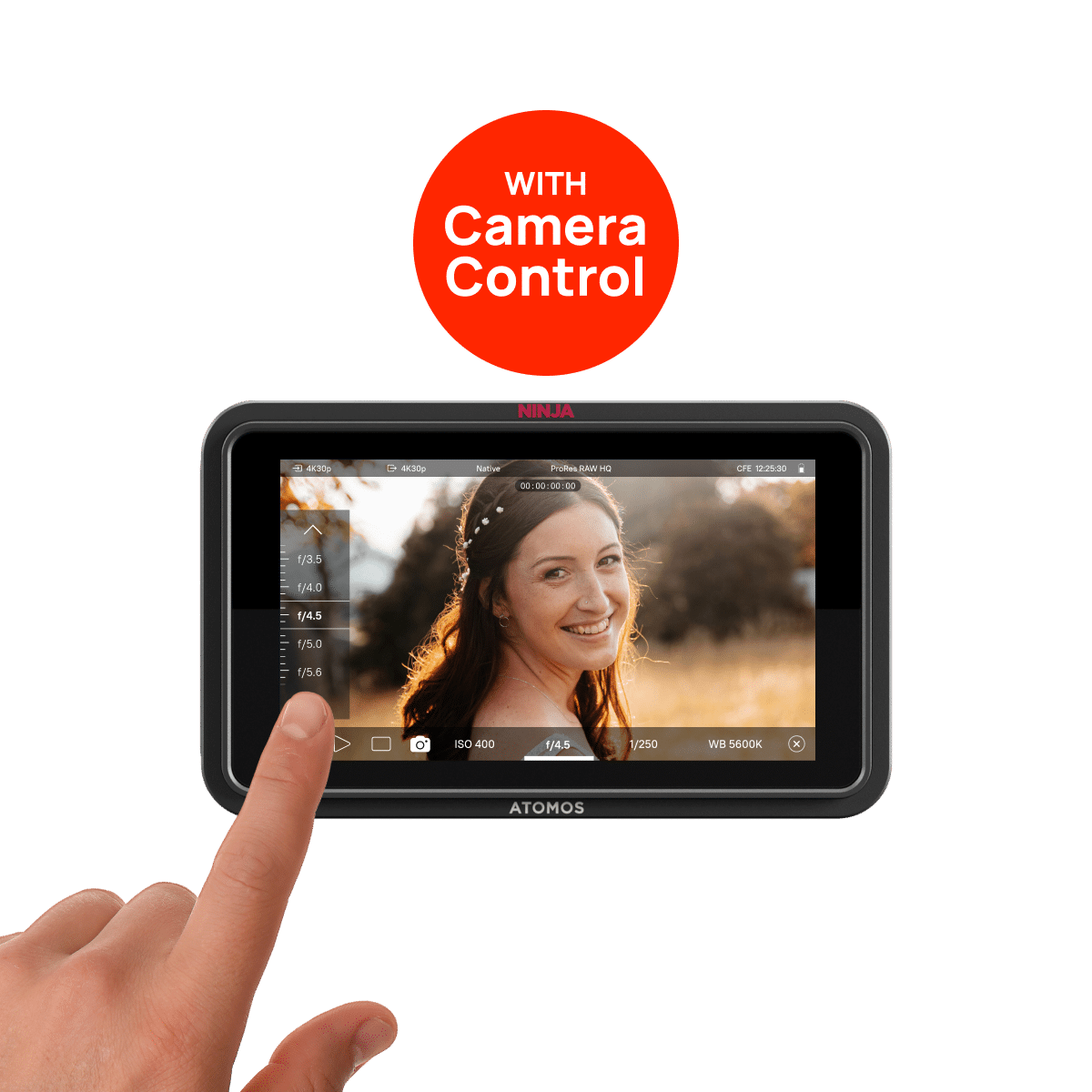 Using intuitive, on-screen sliders you can adjust white balance, lens aperture, shutter speed and ISO. A red edge display indicates when the camera is recording internally, whether triggered by the camera or from the Ninja TX. Control is available for most Canon, Fujifilm, Nikon, Panasonic, and Sony mirrorless cameras over USB-C, and all Z CAM E2 series models (LANC cable required, purchased separately).